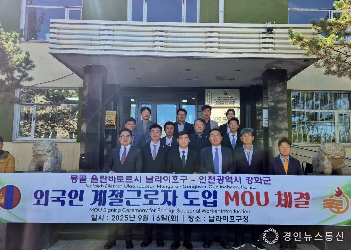 경인뉴스통신 김종득 기자 | 강화군은 지난 16일, 몽골 울란바토르시 날라이흐구를 공식 방문해 ‘외국인 계절근로자 도입에 관한 협약(MOU)’을 체결했다고 밝혔다.