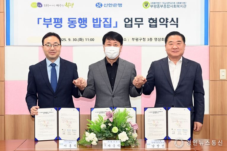 경인뉴스통신 김종득 기자 | 부평구는 지난 30일 구청에서 신한은행·부평중부종합사회복지관과 ‘부평 동행 밥집’ 사업 추진 관련 업무 협약을 체결했다.