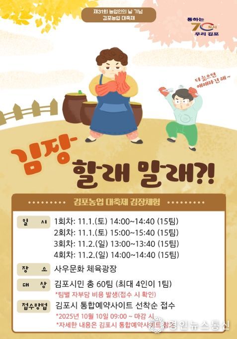 경인뉴스통신 김종득 기자 | 김포시는 '제31회 농업인의 날 기념' 김포농업 대축제를 맞아 오는 11월 1일부터 11월 2일까지 시민참여 김장체험 행사를 개최한다.