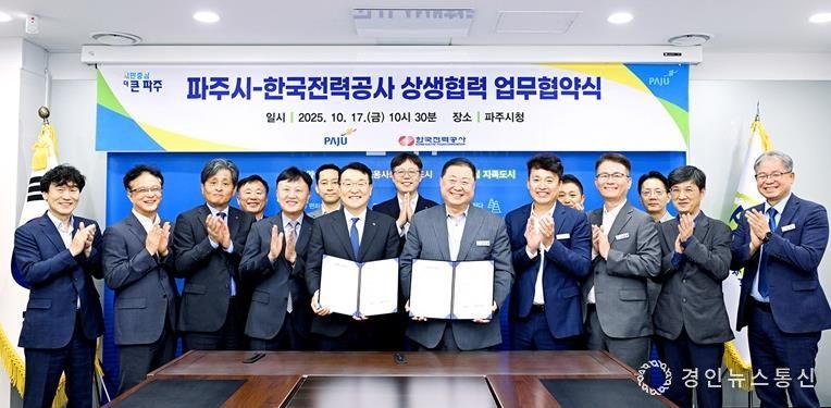 경인뉴스통신 김덕수 기자 | 파주시와 한국전력공사는 지난 17일, 대규모 개발사업의 성공적인 추진과 안정적인 전력 공급을 위한 상생 협력 업무협약을 체결했다고 밝혔다.