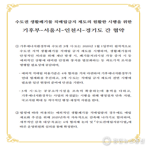 이번 협약은 당초 2015년 4자 간 합의한 대로 수도권의 생활폐기물 직매립금지 제도를 시행하되, 제도 시행 초기 발생할 수 있는 현장의 혼란과 국민 불편을 최소화하기 위한 차원에서 추진됐다.