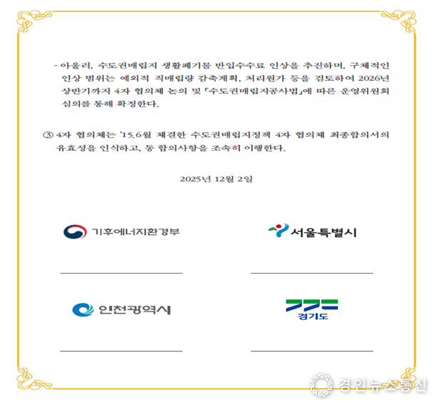 유정복 인천시장은 12월 2일 정부서울청사에서 기후에너지환경부, 서울특별시·인천광역시·경기도 4개 기관 간 수도권 생활폐기물 직매립 금지제도 시행을 위한 업무협약을 체결했다.