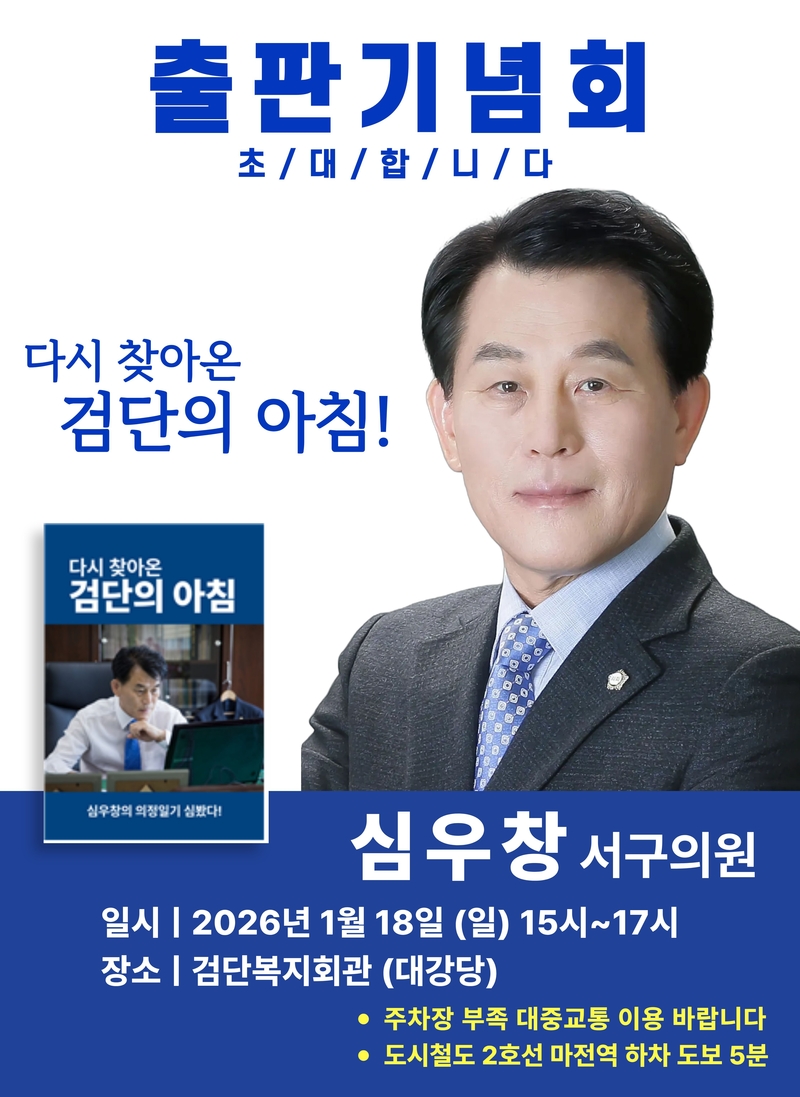 심우창(69) 서구의회 의원은 오는 2026년 1. 18.(일) 오후 3시, 검단복지회관 대강당에서 의정 현장에서의 기록과 함께 걸어온 시간 등 의정일기를 담은 ‘다시 찾아온 검단의 아침!‘이란 책을 발간하면서 출판기념회를 갖는다고 밝혔다.