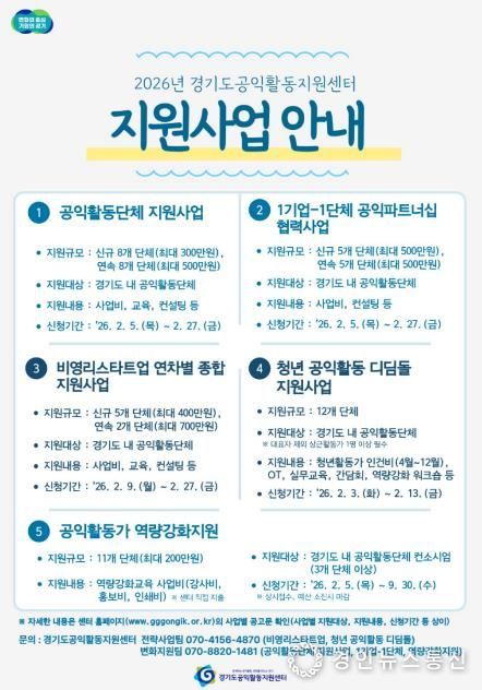 경인뉴스통신 유동익 기자 | 경기도공익활동지원센터가 ‘2026년 경기도 공익활동 지원사업’에 참여할 도내 공익활동 단체를 모집한다.