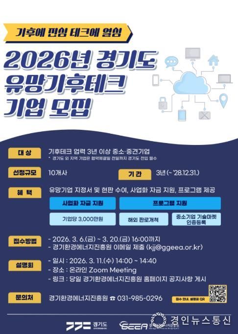 경인뉴스통신 유동익 기자 | 경기도와 경기환경에너지진흥원이 기후위기 대응을 선도할 혁신 기술 보유 기업을 발굴하기 위해 오는 3월 20일까지 ‘2026년 경기도 유망 기후테크 기업’ 10곳을 모집한다.