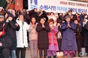 경인뉴스통신 유동익 기자 | 이재준 수원특례시장은 1일 아침 팔달산 서장대에서 시민들과 함께 해맞이를 하고, “시민 여러분께서 소망하시는 모든 것을 성취하시길 기원하겠다”고 말했다. 이재준 시장은 “올해도 시민 여러분과 함께 수원을 더 새롭고, 더 빛나게 만들기 위해 노력하겠다”며 “모든 시민이 수많은 역사와 희망을 만드는 멋진 한 해가 되길 바란다”고 기원했다. 서장대 일원을 가득 메운 시민들은 떠오르는 해를 보며 함께 소원을 빌었다. 수원시는 12월 31일 저녁부터 1월 1일 아침까지 일원에서 시민들과 함께하는 송년·신년 행사를 열었다. 12월 31일 밤 10시 30분부터 행궁광장 특설무대에서 ‘제야음악회’가 열렸다. 자정에는 여민각에서 제야 타종 행사를 열고 2026년 병오년(丙午年)의 시작을 알렸다. 이재준 시장, 이재식 수원특례시의회 의장, 김영진(수원시병)·김준혁(수원시정) 의원, 시민 대표 등이 타종했다. 이재준 수원시장과 김현수 제1부시장, 4개 구청장, 실·국장 등은 1일 오전 9시 현충탑을 참배했다.