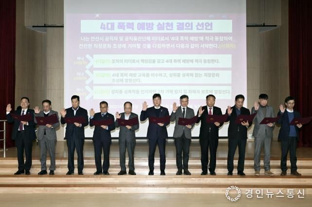 또한 이날 교육에서는 이민근 안산시장을 비롯해 5급 이상 간부 공무원과 안산시 공직유관 10개 단체 대표, 임원이 ‘4대 폭력 예방 실천 결의 선언’을 하며 조직의 리더로서 실천 의지를 다짐하는 시간이 진행됐다.