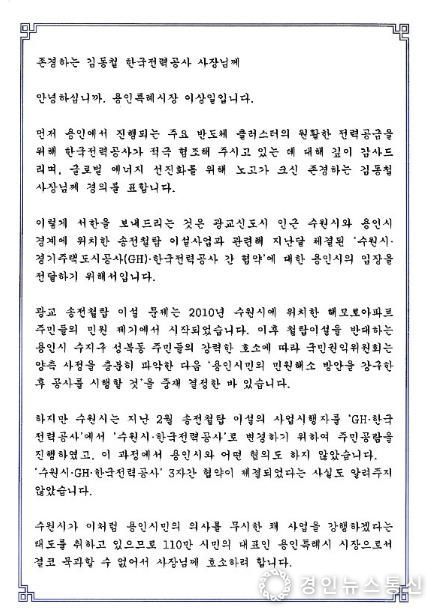 이 시장은 김 사장에 대한 서한에서 2010년 수원시 해모로아파트 주민들의 민원 제기에서 시작된 광교 송전철탑 이설 문제는 이설을 강력히 반대하는 용인시 수지구 성복동 주민들의 호소에 따라 국민권익위원회에서 양측 사정을 고려해 ‘용인 시민의 민원 해소 방안을 강구한 뒤 공사를 시행하라’고 중재한 사실을 강조했다.