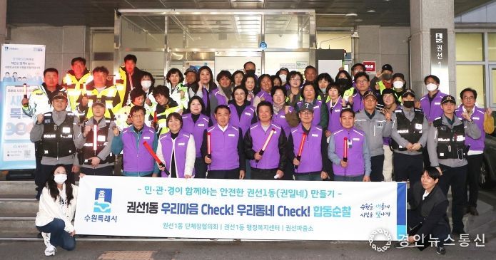 이번 합동 순찰은 권선1동 주민자치회(회장 이상대) 및 권선1동의 주관으로 진행됐으며, 수원남부경찰서 권선파출소의 협조 속에 이재식 의장을 비롯해 30여 명의 지역 단체 회원들이 함께 안전한 지역사회 조성을 위한 뜻을 모았다.