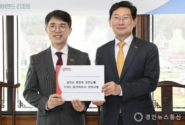 이 시장은 이날 오후 처인구 포곡읍 에버랜드에서 시와 환경부, 삼성물산 리조트 부문이 ‘일회용 컵 사용 감량을 위한 자발적 협약’을 체결한 뒤 김 장관에게 ▲용인종합환경교육센터 건립 ▲동림 공공하수처리시설 설치 ▲백암레스피아 개량 ▲동림 처리구역 하수간선(차집)관로 신설 ▲소규모 하수처리시설 연계관로 정비 등에 필요한 22억3900만원을 환경부의 내년도 예산 책정을 통해 지원해 달라고 부탁하며 관련 자료를 전달했다.