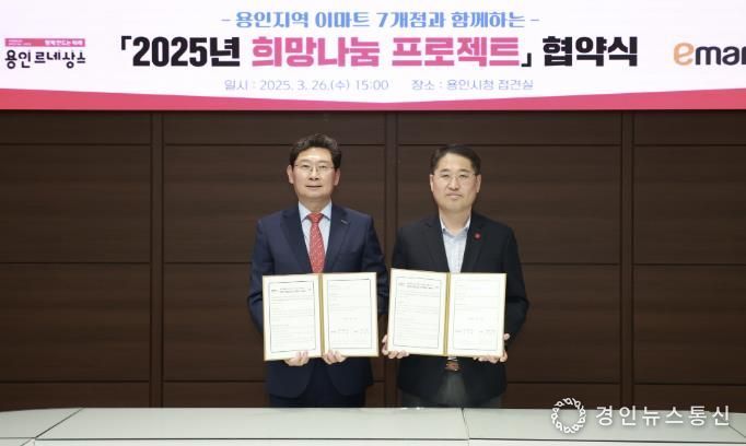 용인시와 이마트는 26일 오후 2025년 희망나눔 프로젝트 협약을 체결하고 어버이날 선물세트, 여름·겨울 필수용품 지원, 김치 나눔, 바자회 등 다양한 복지 사업을 함께 운영하기로 했다. 이마트는 이를 위해 1억 3,580만 원 상당의 물품을 후원할 계획이다.