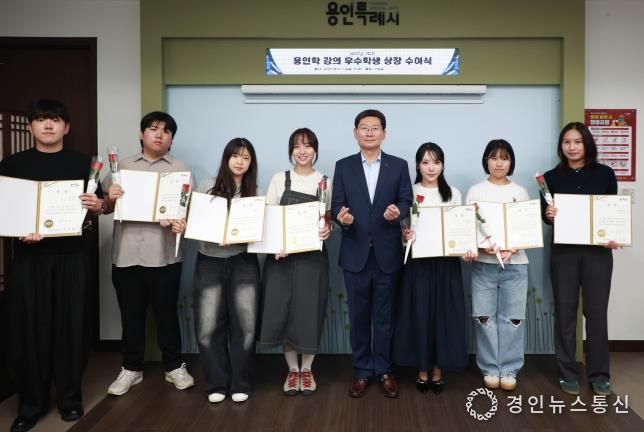경인뉴스통신 유동익 기자 | 이상일 용인특례시장이 27일 시장실에서 지역 내 대학에 교양 과목으로 개설된 ‘용인학 강좌 2025년 1학기 우수 학생 8명에게 상장을 수여했다.