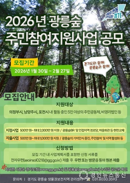 경인뉴스통신 유동익 기자 | 경기도가 광릉숲 생물권보전지역 활성화를 위해 2026년 광릉숲 주민참여지원사업 참여자를 모집한다.