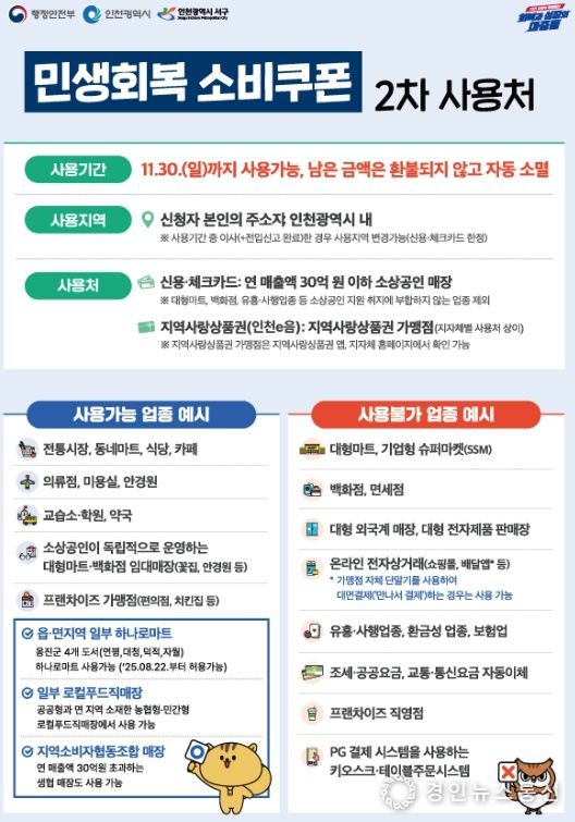 민생쿠폰은 지역사랑상품권(인천e음) 가맹점에서 사용가능하며, 신용·체크카드는 일부 업종을 제외하고 연 매출액이 30억 이하인 음식점, 카페, 동네마트 등 소상공인 매장에서 사용할 수 있다.