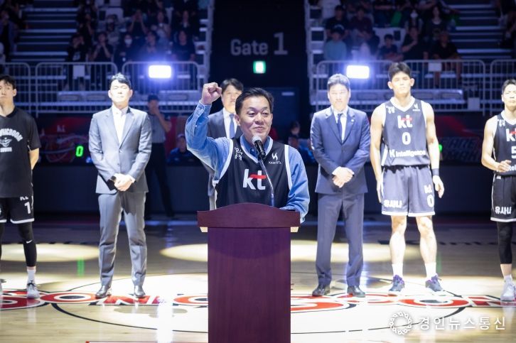 수원KT소닉붐과 부산KCC의 홈 개막전에서 축사를 한 이재준 시장은 “시민과 함께 수원KT 소닉붐의 우승을 기원하며 시민들과 함께 응원하겠다”고 말했다. 이재준 시장은 개막선언을 했다.