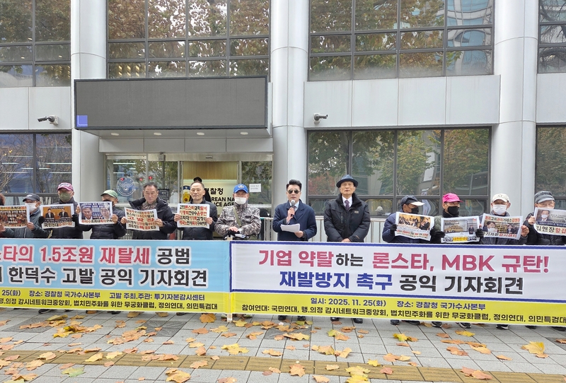 지난 25일, 행·의정 감시네트워크 중앙회, 국민연대, 정의연대, 투기자본 감시센터 등 국내 시민단체들은 경찰청 국가수사본부 앞에서 기자회견을 열고, 론스타와 사모펀드 MBK파트너스의 경제 약탈 행위를 규탄했다.