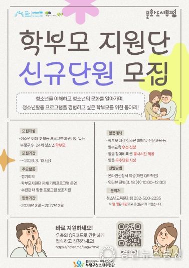 경인뉴스통신 김종득 기자 | 부평구 청소년수련관은 오는 3월 13일까지 2026년 제7기 학부모지원단 ‘데이트’의 신규 단원을 모집한다고 밝혔다.