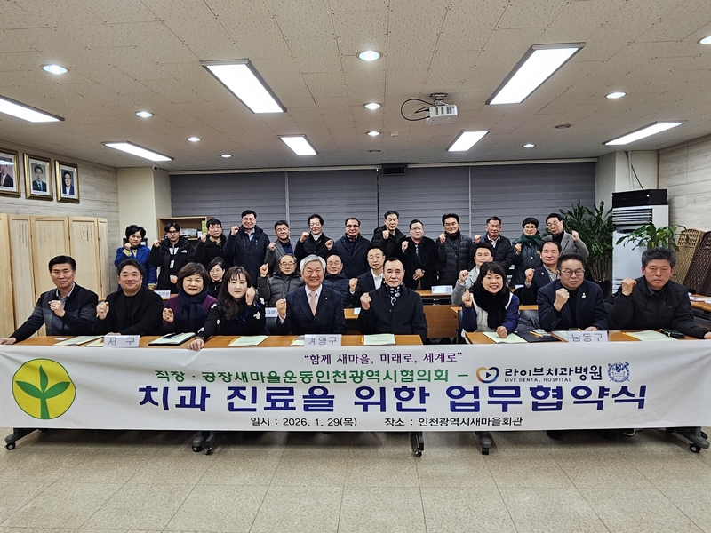 직장‧공장새마을운동인천광역시협의회(회장 정재수)는 1월 29일(목) 인천광역시새마을회관에서 라이브 치과병원 & 하아큐 중앙검진센터와 직공장 회원사 및 지역사회의 건강증진을 위한 업무협약(MOU)을 체결했다.
