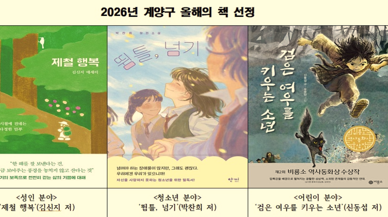 계양구는 10일 ‘2026년 계양구 올해의 책’으로 성인 분야 제철 행복, 청소년 분야 뜀틀, 넘기, 어린이 분야 검은 여우를 키우는 소년 등 3권을 선정했다고 밝혔다.